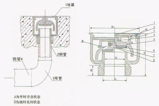 該產(chǎn)品安裝在通向人防護區(qū)以外的排水管上的防護區(qū)內(nèi)端。排水系統(tǒng)的所有管材及附件應(yīng)采用鋼管或給水鑄鐵管。安裝時地漏的頂非面座低于地面5-10mm.